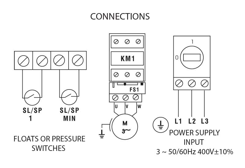• Допълнителен вход за ниско напрежение за контрол на двигателя чрез пресостат или електрически поплавък с превключвател за нормално отворен или нормално затворен контакт.