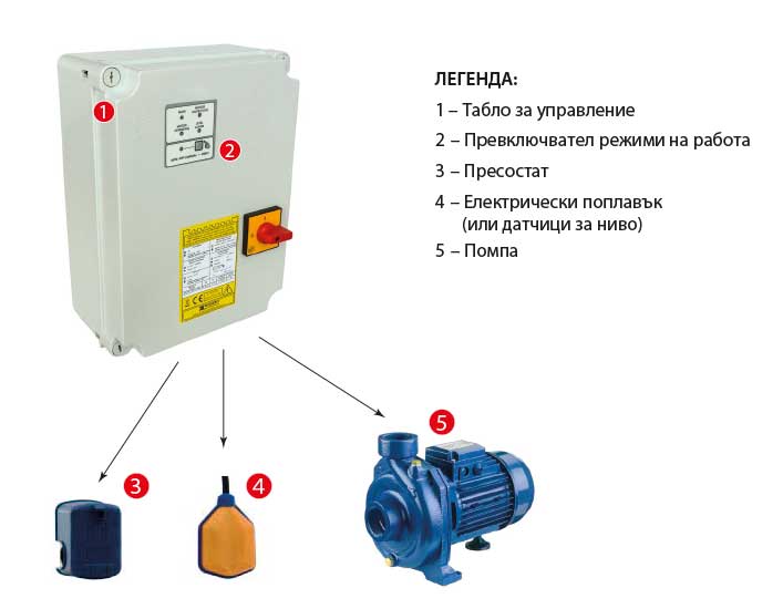 Таблa за управление и защита на една трифазна помпа с универсално приложение и микропроцесорно управление. Предлагат се модели за помпи с мощност до 16 kW. Таблата са с токава защита и защита от работа на сухо по cos Ф. Предназначени са за управление на помпи с директен старт. Могат да работят в 2 режима на работа: ръчен и автоматичен.
