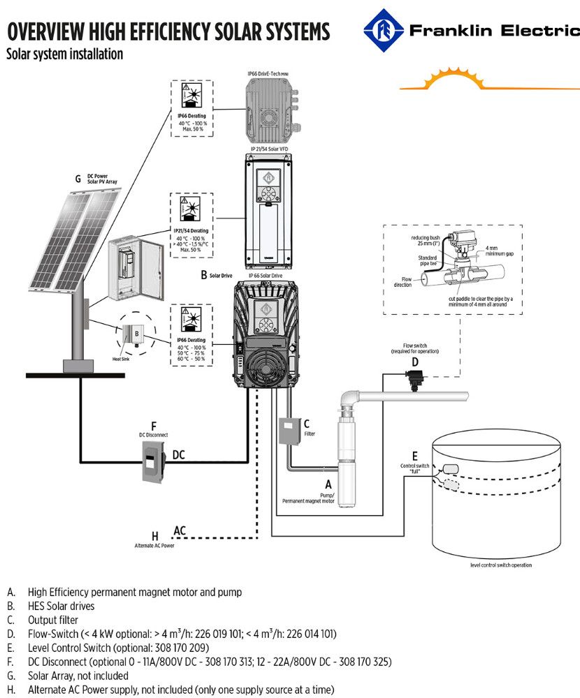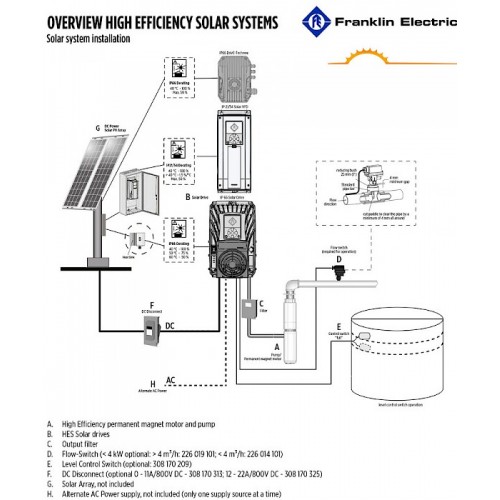 Тези системи, най-общо казано, се състоят от слънчеви панели, които превръщат слънчевата радиация в електрически ток, който задвижва водната помпа. За да използваме тази генерирана мощност за управление на стандартна електропомпа ни е необходим соларен инвертор. Той превръща създадения в панелите постоянен ток в променлив, който е подходящ за електродвигателя на помпата.