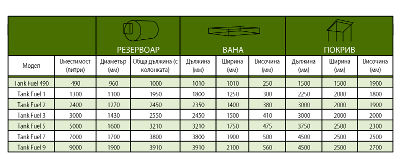 г) ПОКРИВ - По желание TANKFUEL може да бъде доставен с покрив, за да се предпази от атмосферни влияния. Резервоарите с колонки тип Tankfuel TF 50/70 отговарят на всички европейски стандарти за безопасност (придружени са с всички сертификати).