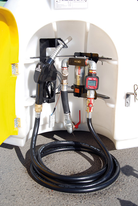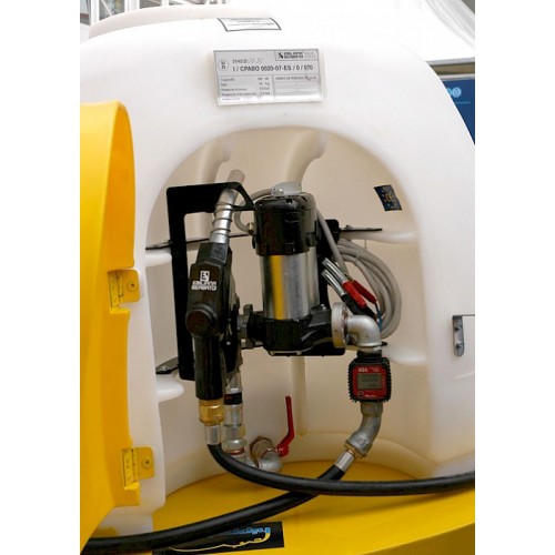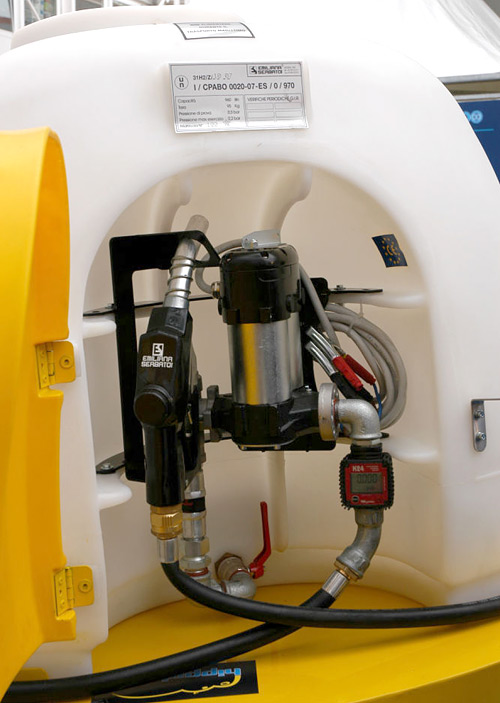 • оборудван е с 12 или 24 V помпа за зареждане с дебит 40 l/min, 5 метра маркуч, автоматичен пистолет и турбинен разходомер К24. Монтирани са в ниша с капак.