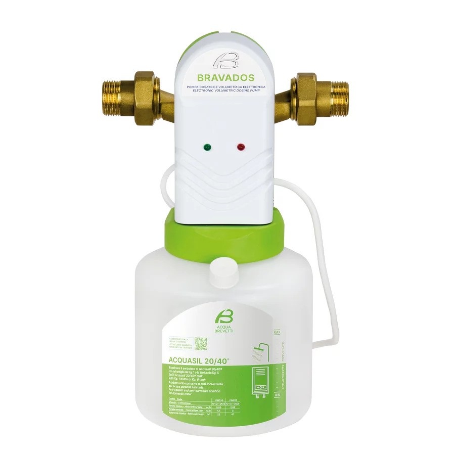 BRAVADOS е дозираща помпа за течна полифосфатна смола AQUASIL 20/40. Използва се за битови инсталации. Предотвратява отлагането на варовик и има антикорозионно действие. Обработената вода остава годна за пиене Системата BRAVADOS започва дозирането от минимално 90л./час като впръсква AQUASIL 20/40 на всеки 0.3 литра.