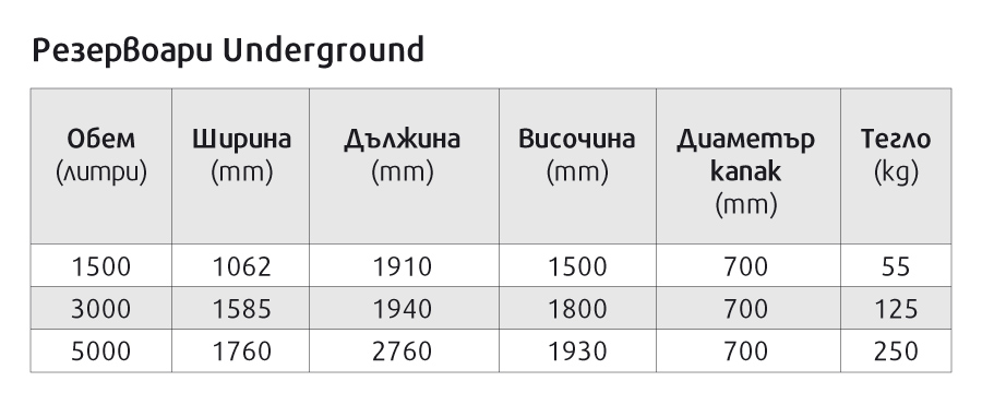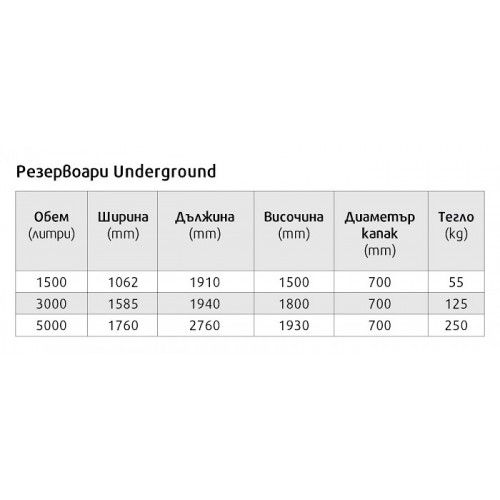 Хоризонтални резервоари за вкопаване, изработени от полиетилен с висока плътност. Подходящи са за съхранение на питейна вода. Предлагат се с обем от 1500 до 5000 литра.